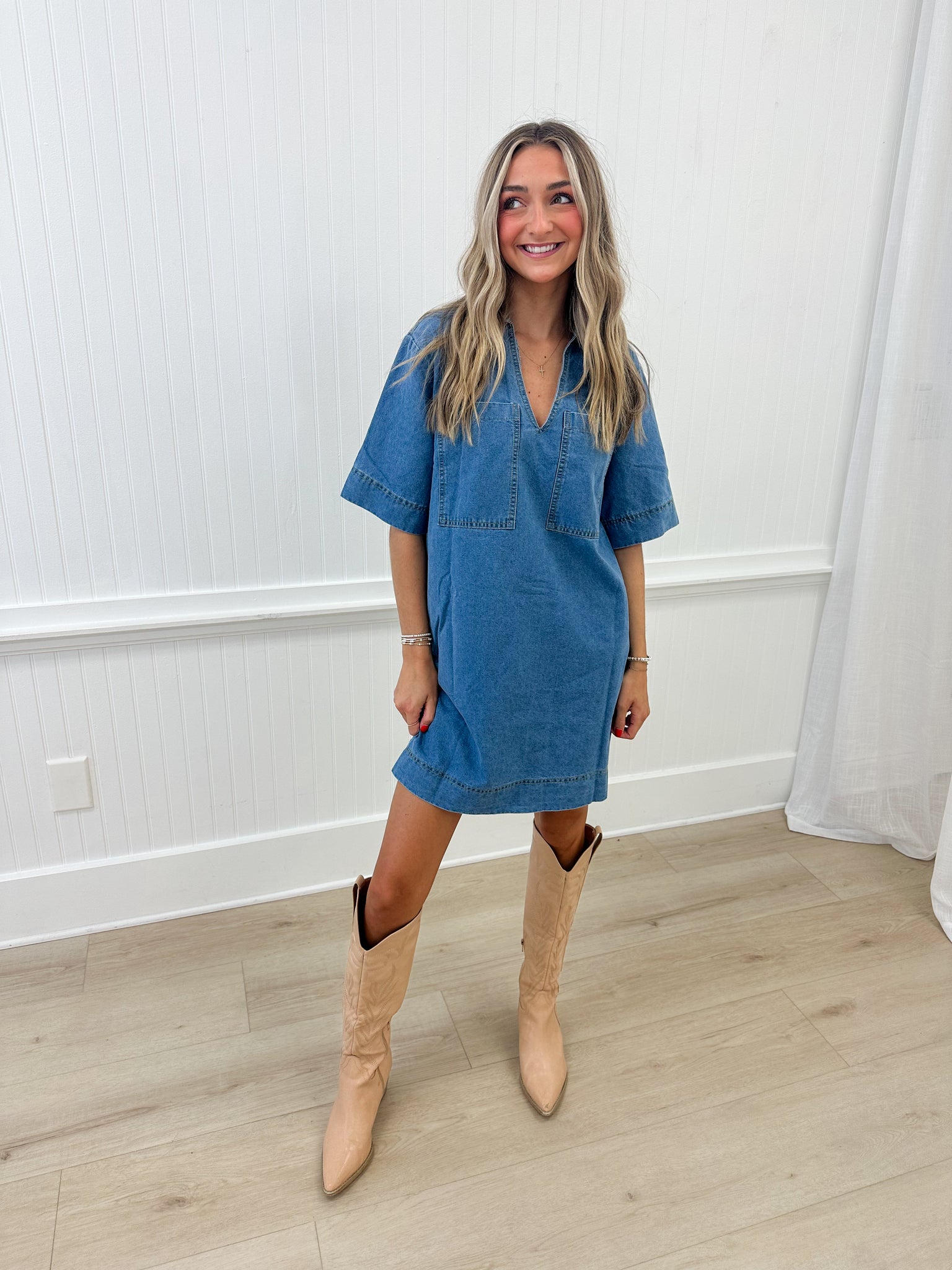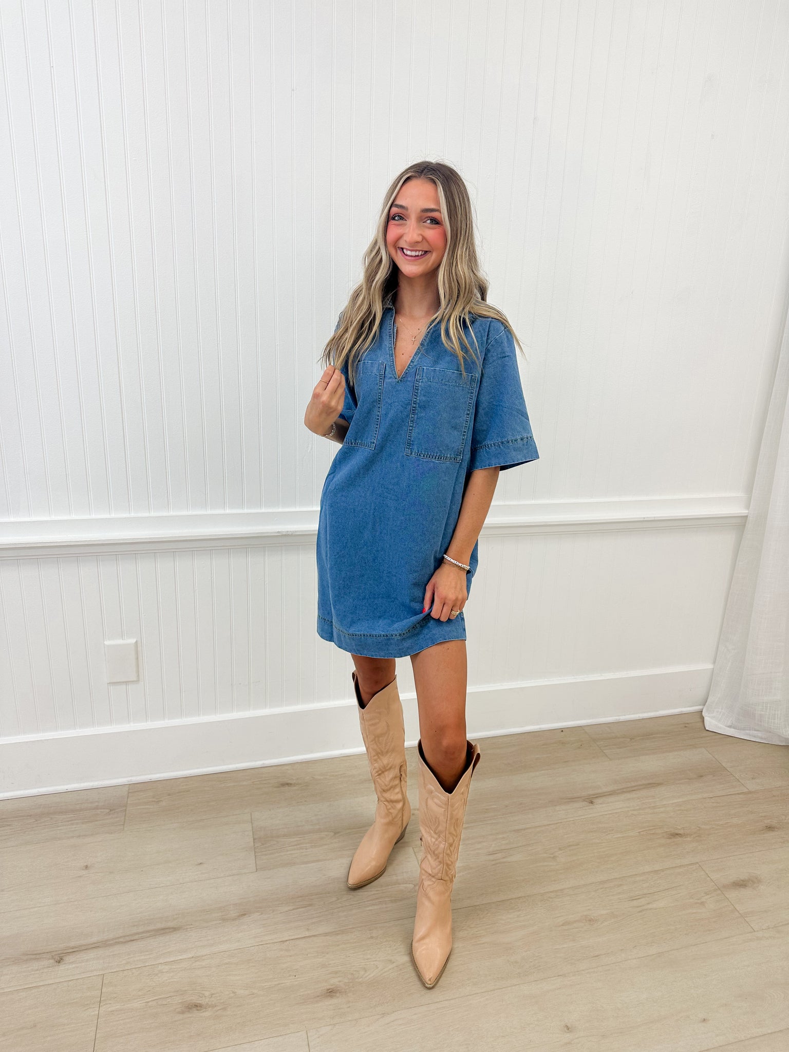 Meet your new go-to: the Blue Jean Baby Dress. This oversized denim dress brings effortless cool with a relaxed fit that flatters every body. Designed with classic jean details and a laid-back silhouette, it’s the perfect mix of casual and chic. Pair it with sneakers for an everyday vibe, or dress it up with boots and bold accessories for a standout look.