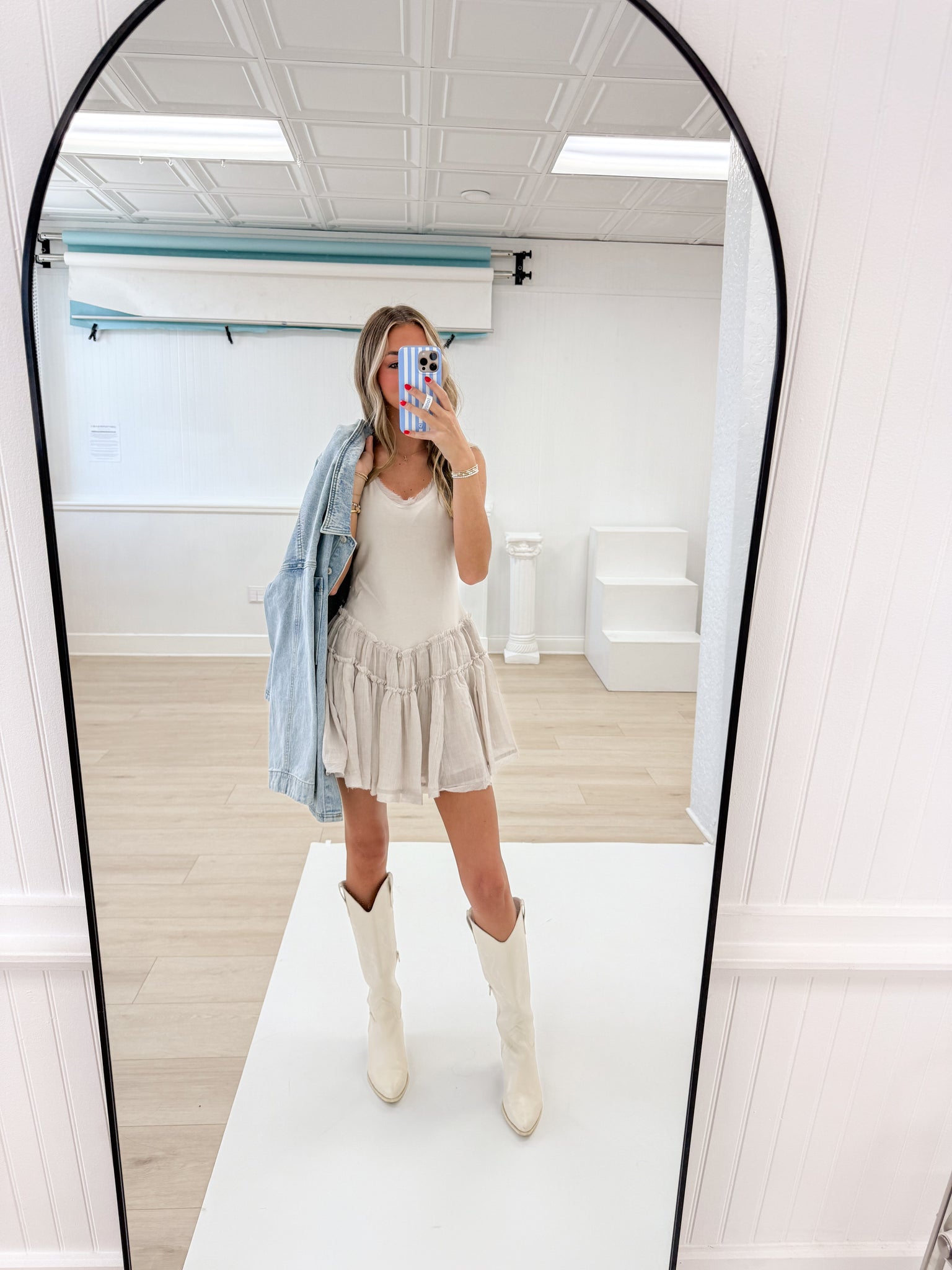 Forever romantic, Love Drop Waist dress features a relaxed, dropped waist silhouette with a Voop neckline and tiered skirt. Frayed edge detailing adds a laid-back touch.